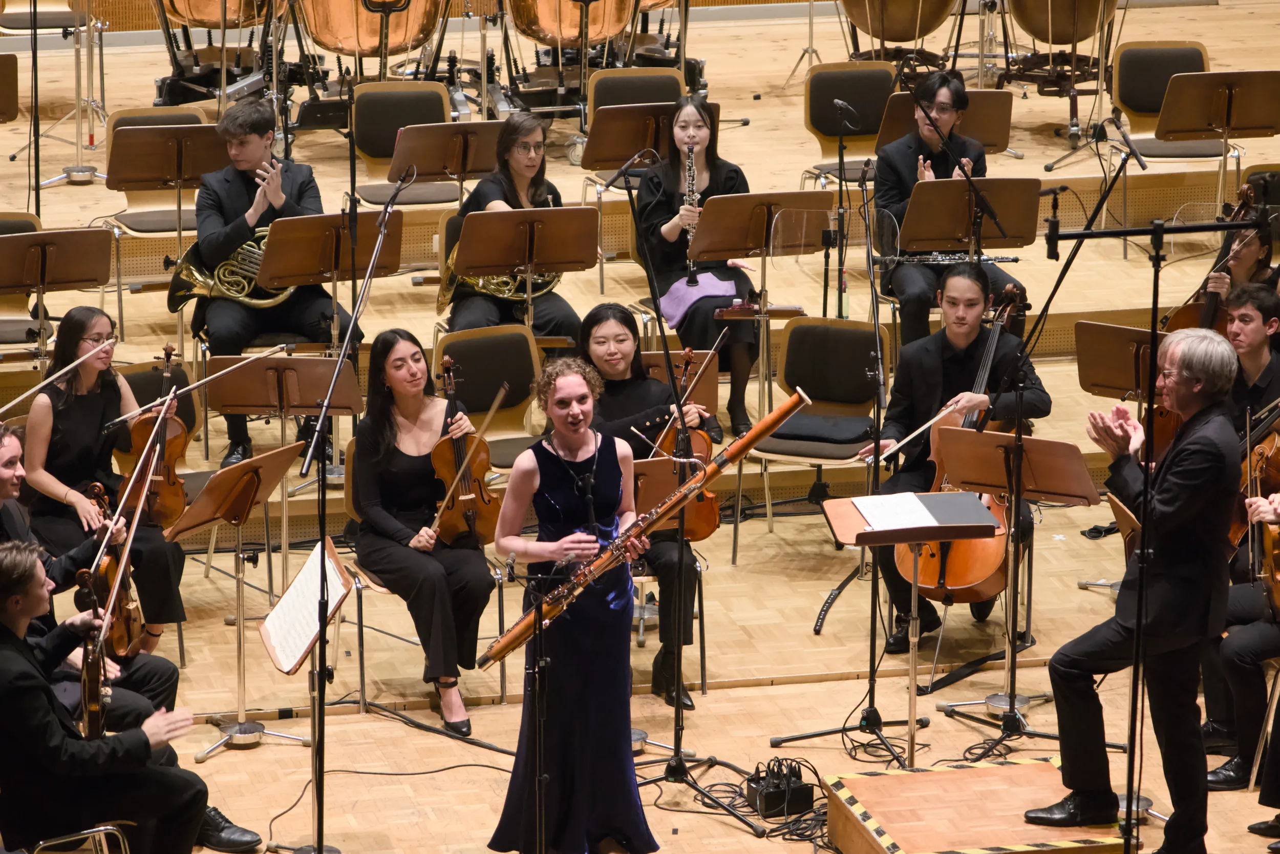 Nach der Pause erklang dann Mozarts Fagottkonzert in B-Dur, das der Salzburger im zarten Alter von 18 Jahren komponiert und mit diesem Werk erstmals den musikalischen Boden des Bläserkonzerts betreten hatte. Damit trug Mozart nicht unwesentlich zur Emanzipation des einstigen Continuo-Instruments bei, versorgte er das tiefe Doppelrohr doch mit berückend schönen Melodien und Phrasen. Julia Flint (aus der Klasse Fredrik Ekdahls) musizierte die drei Sätze umsichtig, poetisch und an den entsprechenden Stellen virtuos – stets im Einklang mit dem wunderbar begleitenden Orchester. Deutlich wurde vor allem im Mittelsatz, wie kantabel das Fagott doch klingen kann, wie intim die Klangsphäre gestaltet werden kann, wenn fähige und gut geleitete Musiker:innen sich gemeinsam der oft unkompliziert und vielleicht einfach wirkenden Musik Mozarts widmen. Diese ›Mozärtlichkeit‹ ist schwer zu erreichen; den Trossingern gelang dies allerdings bravourös, was der lang anhaltende Beifall für Solistin und Orchester unterstrich.