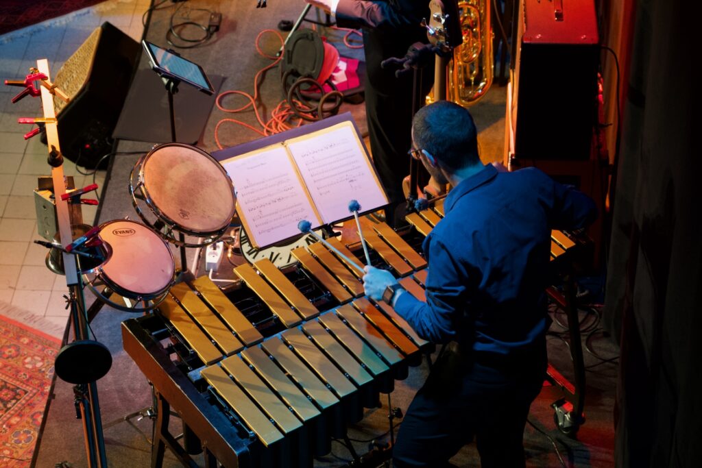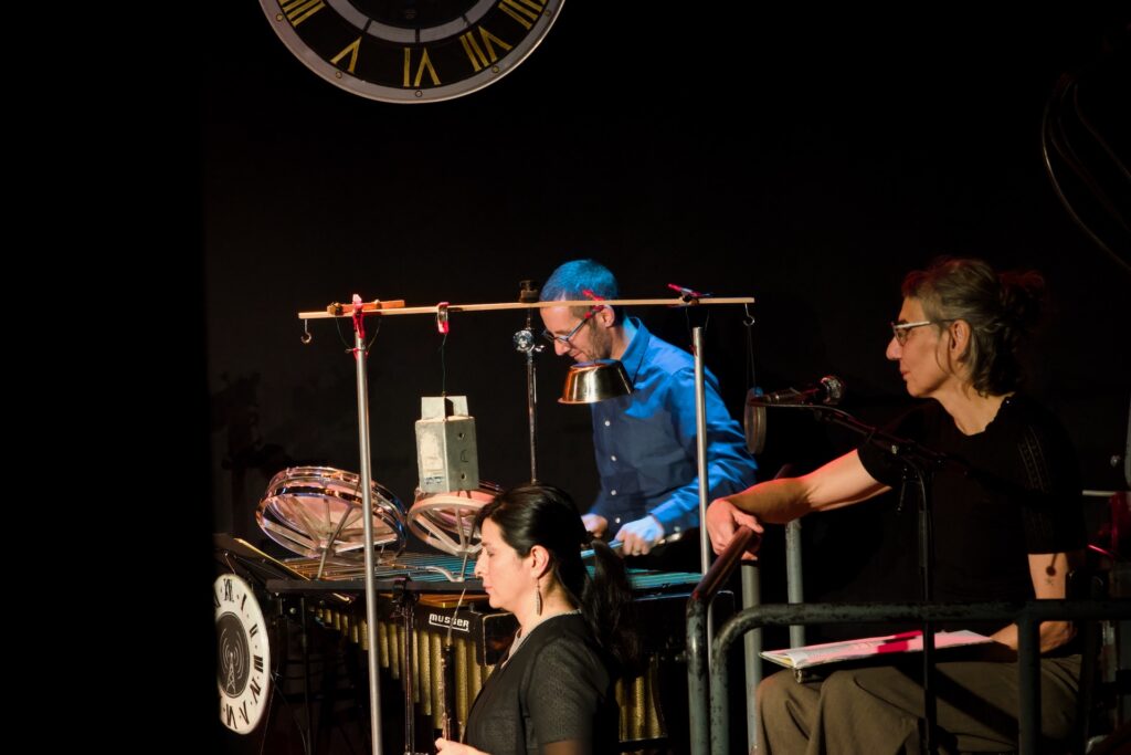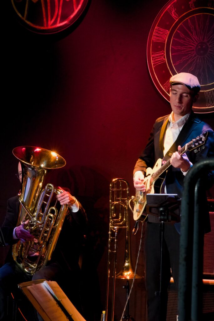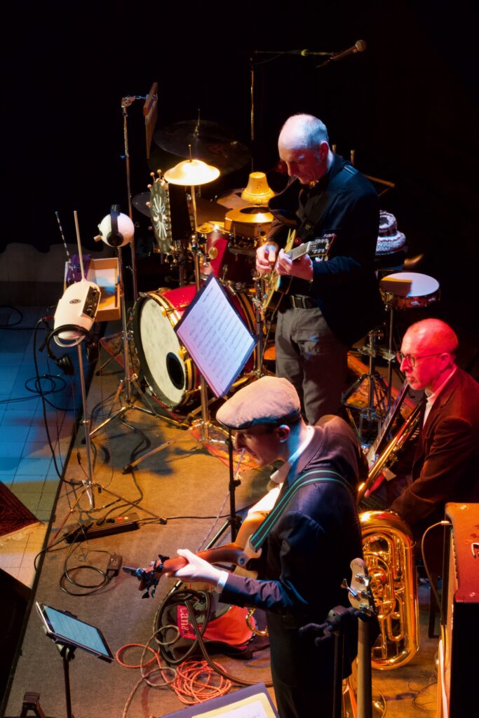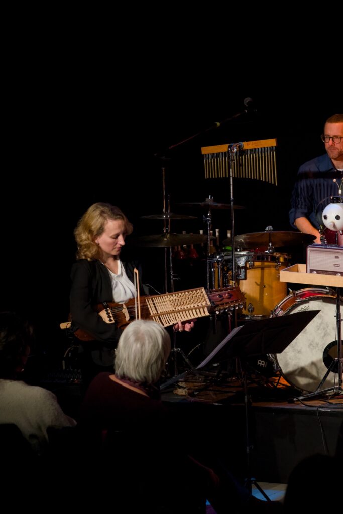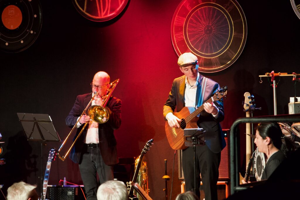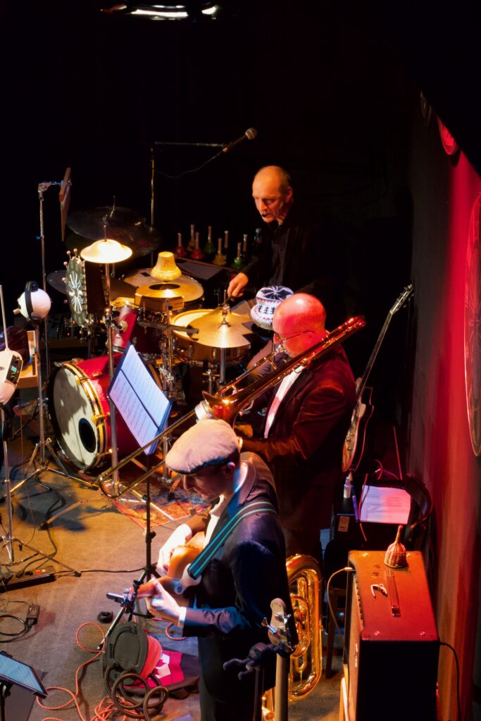 Vermisste man gelegentlich die dramaturgische Stringenz im Programm – vor allem im dritten Teil des Konzerts war vom eigentlich sehr überzeugenden Zeitreisekonzept nicht mehr viel zu spüren – bestach das hervorragend spielende und miteinander musizierende Ensemble mit geistreichen Arrangements für diese ungewöhnliche Besetzung. Schlagwerklastige Grooves (eine wahre Freude – und bei zwei fähigen Schlagzeugern auch kein Wunder) wurden geschmackvoll ergänzt um teils skurriles Instrumentarium wie etwa eine mittels Luftpumpe zum Borduninstrument umgebaute Shruti-Box, ein zur Trommel umfunktioniertes Banjo oder das überzeugend gespielte Theremin unter den Händen Kochs. Dessen Ensemblemitglieder potenzierten die vom Schlagzeuger und Moderator ausgehende Spielfreude im kurzweiligen, aber doch fast zweieinhalbstündigen Programm. Martin Schäfer brillierte mit sensiblen Gitarrenklängen und virtuosen Sololinien, Tobias Rägle steuerte am tiefen Blech warme Klänge und – wo nötig – ordentlich Schalldruck bei, Joe Kenney erwies sich als kongenialer Partner am Vibraphon oder Drumset und verblüffte nicht selten mit fetzigen Soli und geschmackvollen Begleitklängen zugleich. Der eher grundtönige und warme Klang des Ensembles profitierte ungemein vom Bratschenspiel Laura Jörres (auch an der schwedischen Nyckelharpa zu erleben) sowie von den den Gesamtklang veredelnden Englischhorn-Klängen Ximena Povedas. Es ist keine leichte Aufgabe, aus diesen scheinbar wild kombinierten Instrumenten einen überzeugenden Bandklang zu zaubern – das Konzert im Kesselhaus bewies allerdings, dass dies im Fall von TUBONG! absolut möglich ist. So etwas hat man nur selten gehört. Den absoluten Höhepunkt bildeten gleich zwei Nummern: Einmal Baden Powells Canto de Ossanha das in dieser Besetzung hervorragend zur Geltung kam und den flinken Fingern Schäfers und Jörres ausgesprochen gut stand, sowie eine Art von Melodram, in welchem Zipses Textvortrag einer fiktiven Geschichte über den zeitreisenden Albert Einstein von je passenden Sounds aus der Band unterlegt wurden.