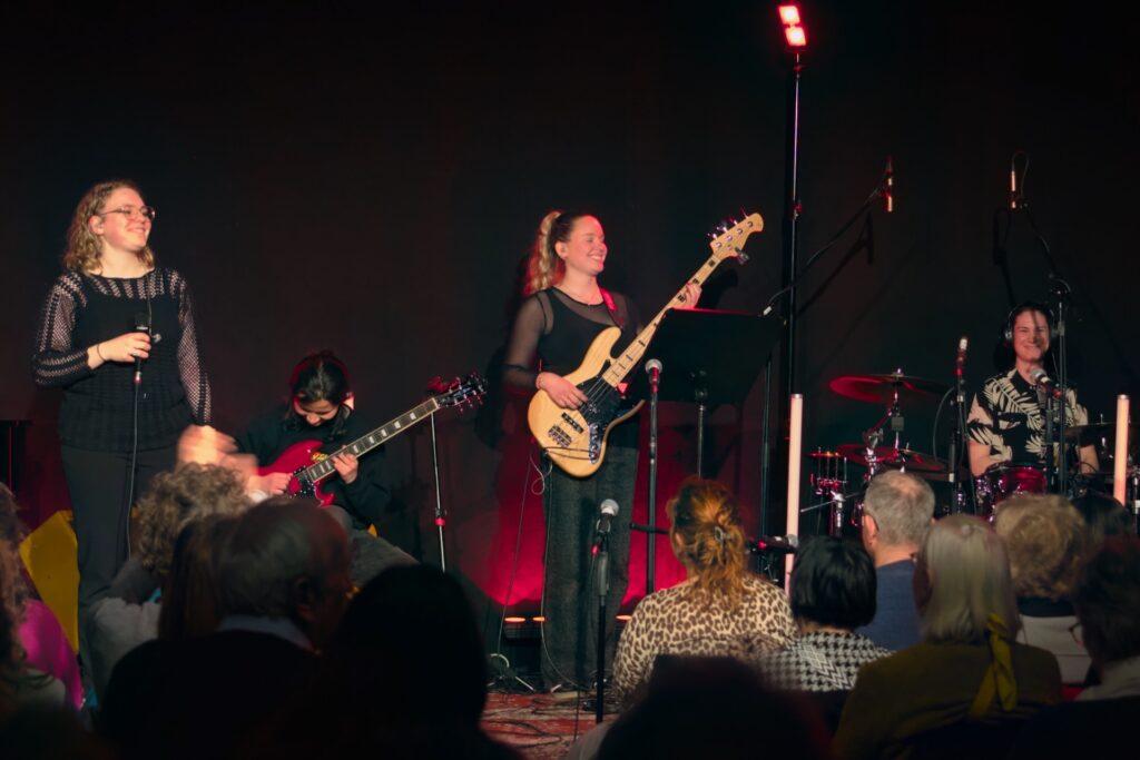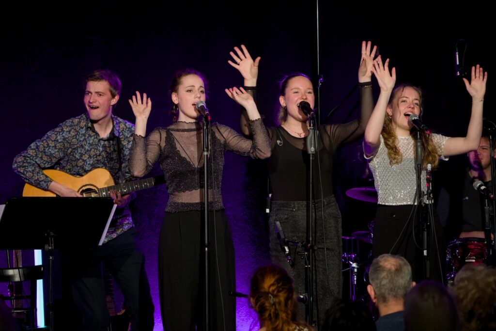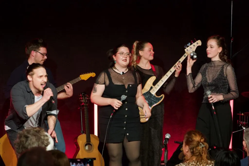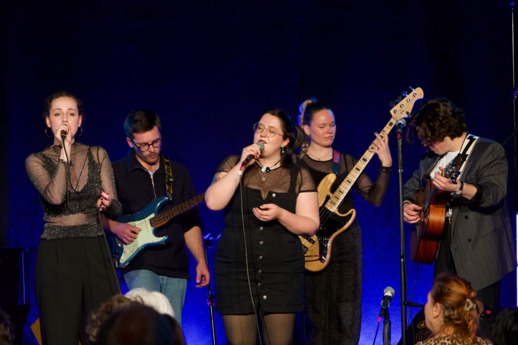 Der letzte Teil des Konzerts gehörter den Prüflingen, die tags zuvor ihre Zwischen-, Bachelor- oder Masterabschlüsse gespielt hatten. Caroline Weber fügte dem Programm mit dem progressive Metal Track Pisces eine laute und energievolle Facette hinzu: Das komplexe Stück spielt mit ungeraden Taktarten und changiert von sanfteren Rock-Klängen hin zu ohrenbetäubenden Growls und »Voll-auf-die-Zwölf«-Drumset-Sound. Mit Philipp Kleins bewegender Interpretation des Faber-Songs Du schläfst stand abermals ein krasser Stilwechsel bevor, erklang zugleich ein weiterer Höhepunkt im starken Finale: Im kleinen Ensemble, von Posaune (Silvan Broghammer) und Cello (Lea-Marie Ziegler) begleitet, gelang es dem Sänger innerhalb kürzester Zeit alle Aufmerksamkeit des Saals auf sich zu ziehen: Selten erlebt man derart stimmige Auftritte, die auf allen musikalischen Ebenen zu Herzen gehen und in (nach kurzer nachlauschender Stille) frenetische Beifallssstürme münden. Selin Solak (Gesang) schloss daran mit der virtuosen und unglaublich groovigen Nummer Where is my Husband der Pop-Sängerin RAYE an, wobei insbesondere die RnB-Einflüsse in der Musik des Originals in Solaks Interpretation sehr gut zur Geltung kamen. Auch hier (wie bei allen anderen Beiträgen auch) brillierte die Rhythmusgruppe, die in besonderem Maße von den beiden Gitarristen Mathis Schuller und Mattheo Mohn getragen wurde.