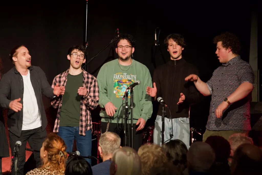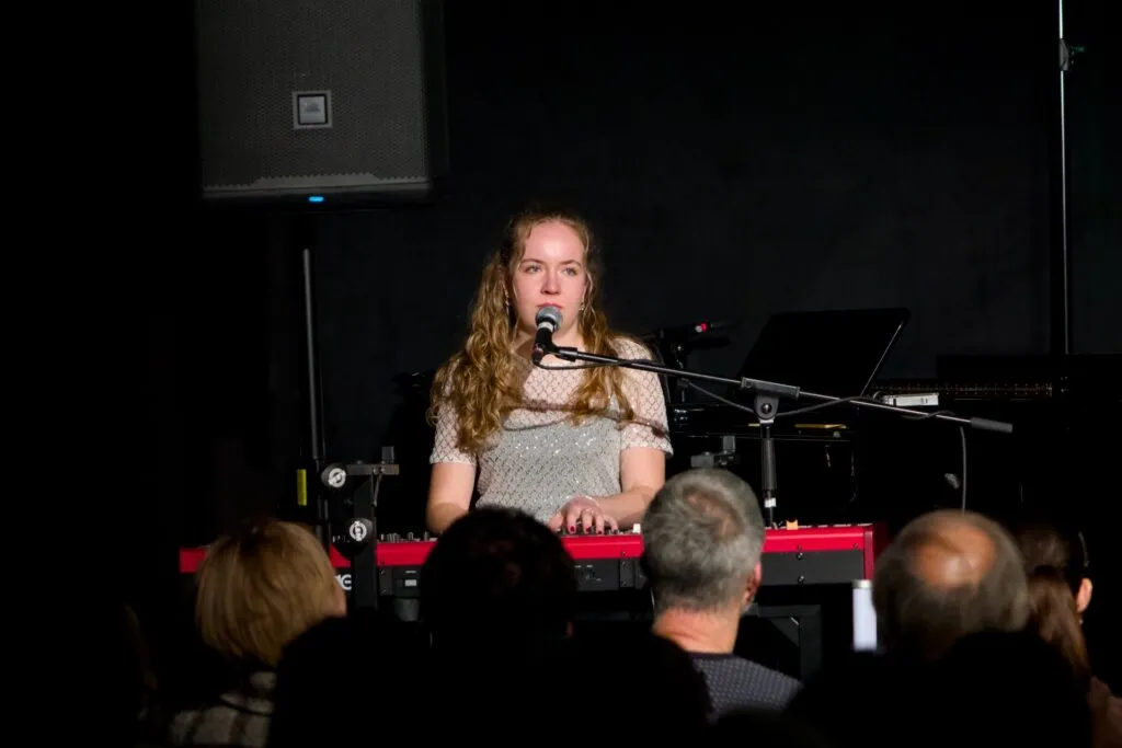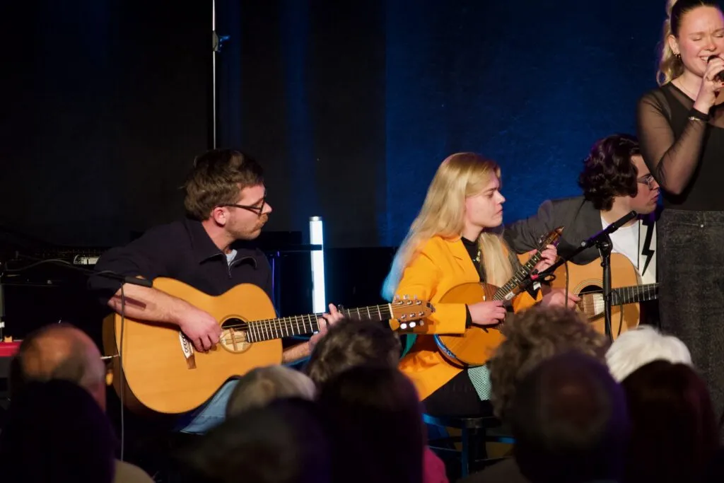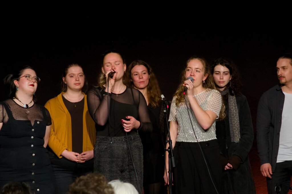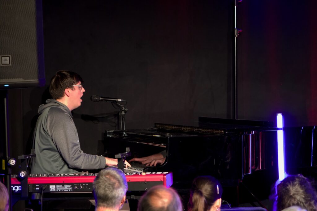 Der letzte Teil des Konzerts gehörter den Prüflingen, die tags zuvor ihre Zwischen-, Bachelor- oder Masterabschlüsse gespielt hatten. Caroline Weber fügte dem Programm mit dem progressive Metal Track Pisces eine laute und energievolle Facette hinzu: Das komplexe Stück spielt mit ungeraden Taktarten und changiert von sanfteren Rock-Klängen hin zu ohrenbetäubenden Growls und »Voll-auf-die-Zwölf«-Drumset-Sound. Mit Philipp Kleins bewegender Interpretation des Faber-Songs Du schläfst stand abermals ein krasser Stilwechsel bevor, erklang zugleich ein weiterer Höhepunkt im starken Finale: Im kleinen Ensemble, von Posaune (Silvan Broghammer) und Cello (Lea-Marie Ziegler) begleitet, gelang es dem Sänger innerhalb kürzester Zeit alle Aufmerksamkeit des Saals auf sich zu ziehen: Selten erlebt man derart stimmige Auftritte, die auf allen musikalischen Ebenen zu Herzen gehen und in (nach kurzer nachlauschender Stille) frenetische Beifallssstürme münden. Selin Solak (Gesang) schloss daran mit der virtuosen und unglaublich groovigen Nummer Where is my Husband der Pop-Sängerin RAYE an, wobei insbesondere die RnB-Einflüsse in der Musik des Originals in Solaks Interpretation sehr gut zur Geltung kamen. Auch hier (wie bei allen anderen Beiträgen auch) brillierte die Rhythmusgruppe, die in besonderem Maße von den beiden Gitarristen Mathis Schuller und Mattheo Mohn getragen wurde.