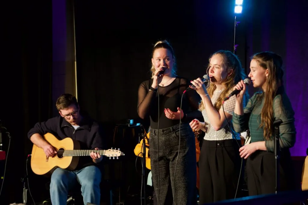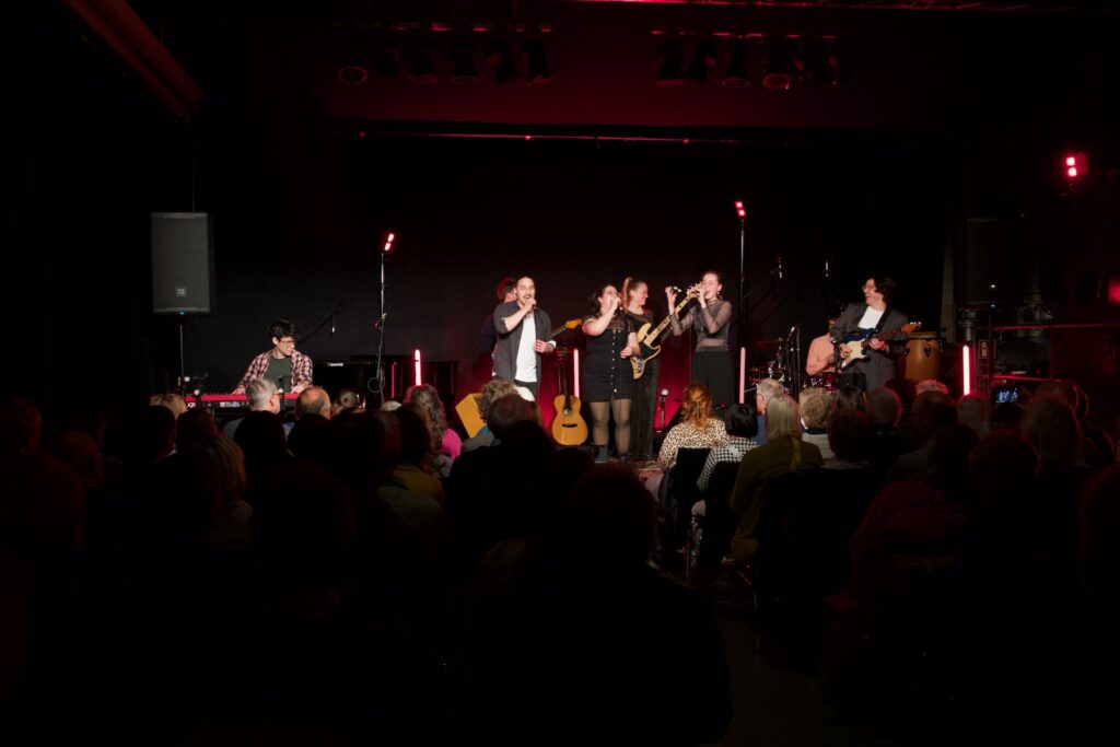 Ehe man sich’s versah, war bereits die erste Konzerthälfte des knapp zweieinhalbstündigen Abends vorüber und nach der Pause ging es dann sogleich in abermals gänzlich anderen Gefilden mit dem JazzPop-Chor unter der Leitung von Sebastian Oberlin weiter. Mit dem an Beethovens Neunter Sinfonie angelehnten Gospel-Klassiker Joyful, Joyful bewiesen die Studierenden ihre Freude am Gospelgesang und brachten ein bisschen Sister Act ins Hohner-Areal. Schade, dass der Chor hier nur einen Song präsentierte – man hätte gerne mehr gehört. Ebenso schade ist auch der Weggang des Chorleiters, der in den letzten drei Semestern einigen Schwung in den zuvor etwas fahrig organisierten Chor gebracht hatte: Man hofft auf glückliche Nachbesetzung und weitere Fortschritte in diesem etwas unterbelichteten Bereich der Abteilung. Nach den sakralen Klängen wandelte sich das Blatt dann abermals hin zu einigen der großen Hits der letzten Jahrzehnte. Mit Sheryl Crow, dem Namen nach in Deutschland erstaunlicherweise nicht übermäßig bekannt, die Songs dafür umso mehr, hat sich die große Combo befasst und gleich vier Songs der US-amerikanischen Musikerin mitgebracht. Die vor allem in den 1990er-Jahren enorm erfolgreichen Ohrwurm-Hits wie Can’t Cry Anymore oder All I wanna do verfehlten auch hier ihre Wirkung nicht, sodass das Publikum sichtlich begeistert für die starken Auftritte der Studierenden applaudierte. Abermals bewiesen die überzeugenden Sänger:innen, die scheinbar mühelos zwischen den verschiedenen Genres und Gesangstechniken wechselten, die hohe Qualität der JazzPop-Ausbildung im beschaulichen Trossingen: Philipp Schulz, Pia Schreiweis und Amelia Kneer brachten mit großer Präsenz, ansteckender Spiel- und Singfreude und souveräner Gesangstechnik Klassiker des Mainstream-Rock auf die dann volle Bühne im Kesselhaus.